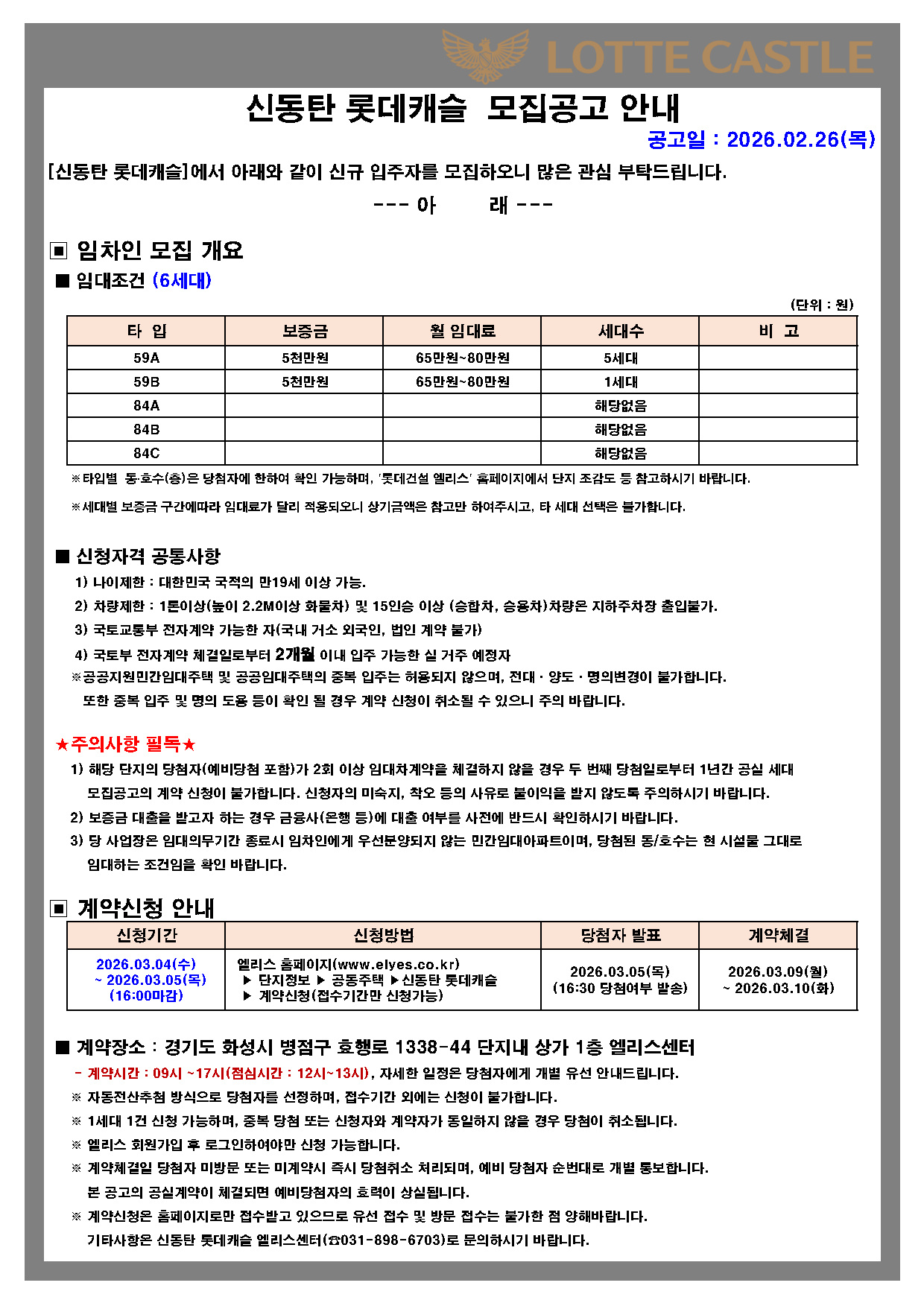 [신동탄 롯데캐슬] 공실세대 계약신청 안내(접수기간: '26/03/04 ~ 26/03/05)----->마감되었습니다.