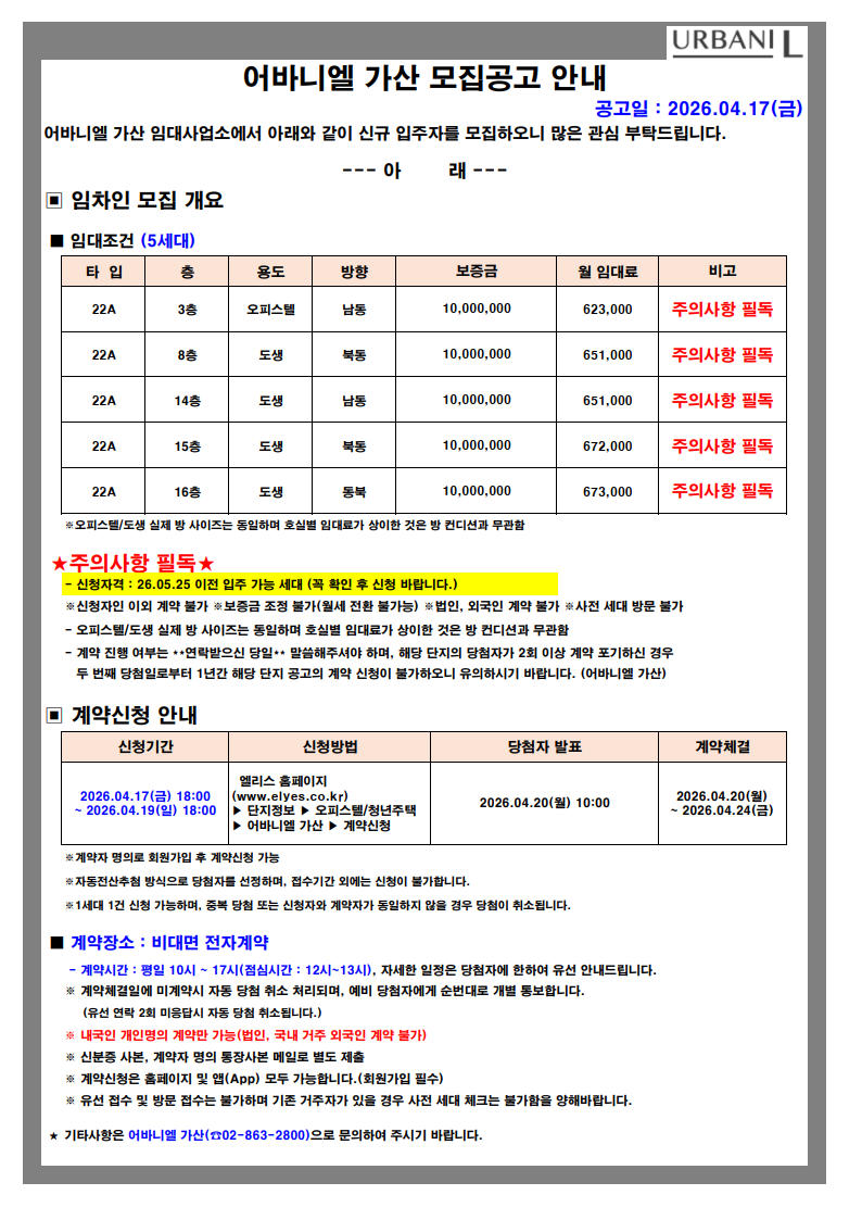 [어바니엘 가산] 공실세대 모집공고 (접수기간: 4/17~4/19)