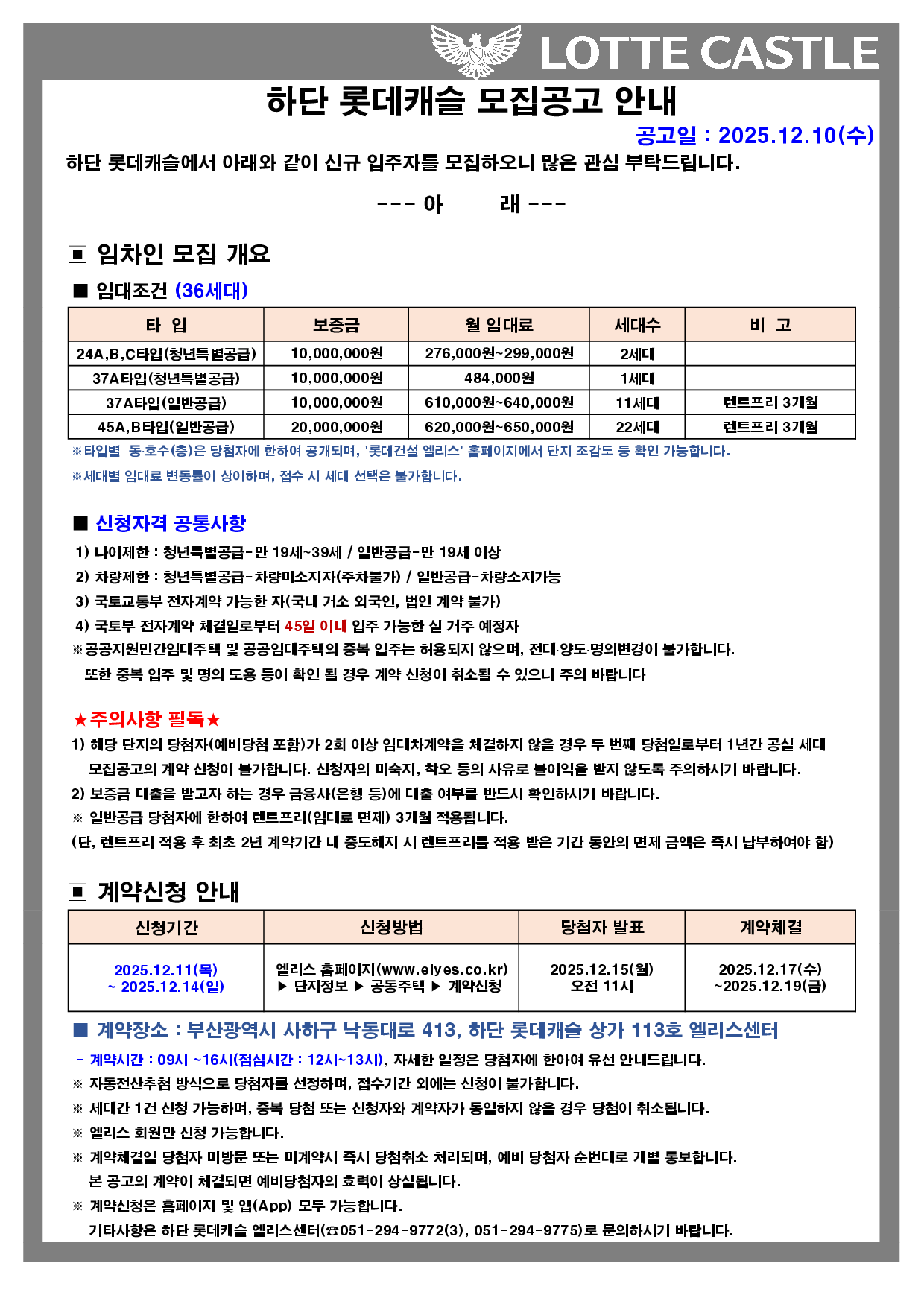 [하단 롯데캐슬]재임대 모집공고(접수기간:25.12.11~25.12.14)