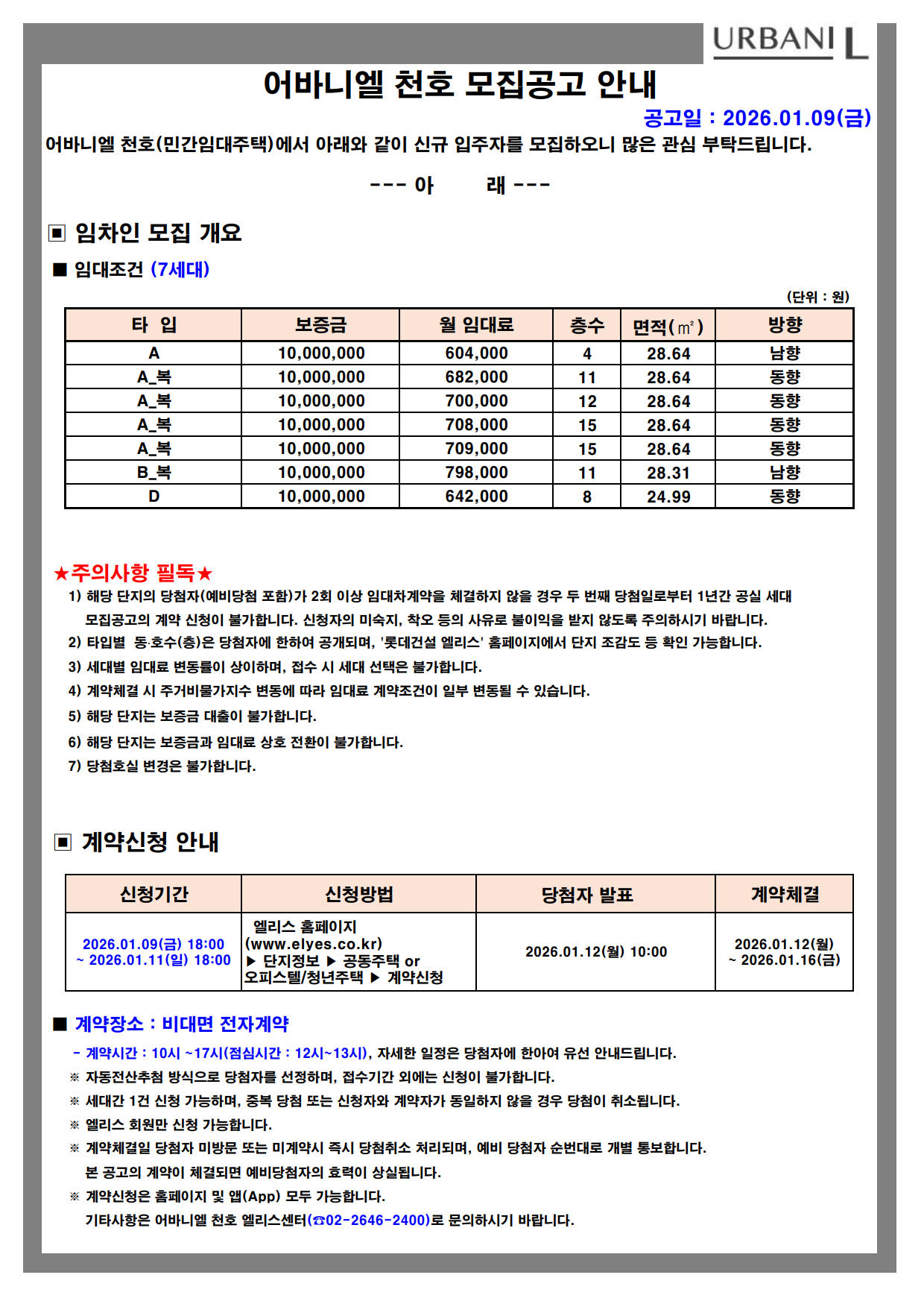 [어바니엘 천호] 공실세대 모집공고 (접수기간 : 1/9 ~ 1/11)
