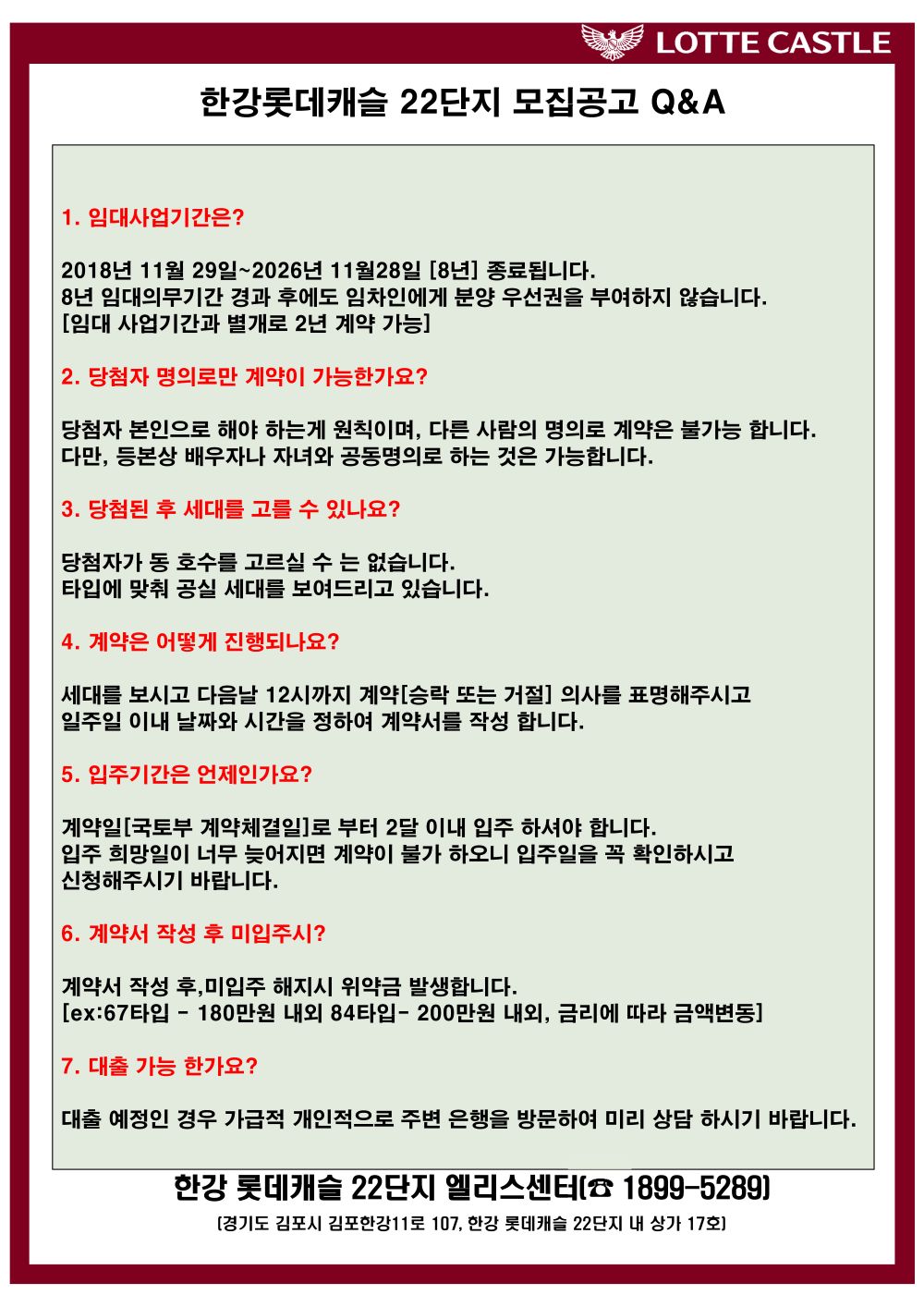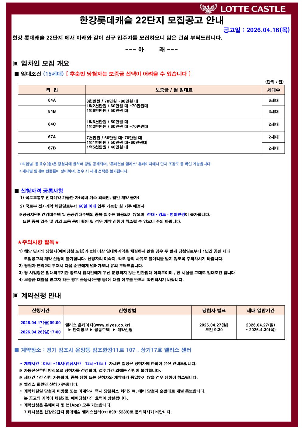 [한강 롯데캐슬 22단지]재임대 모집공고 안내(접수기간:26.04.17~26.04.26)