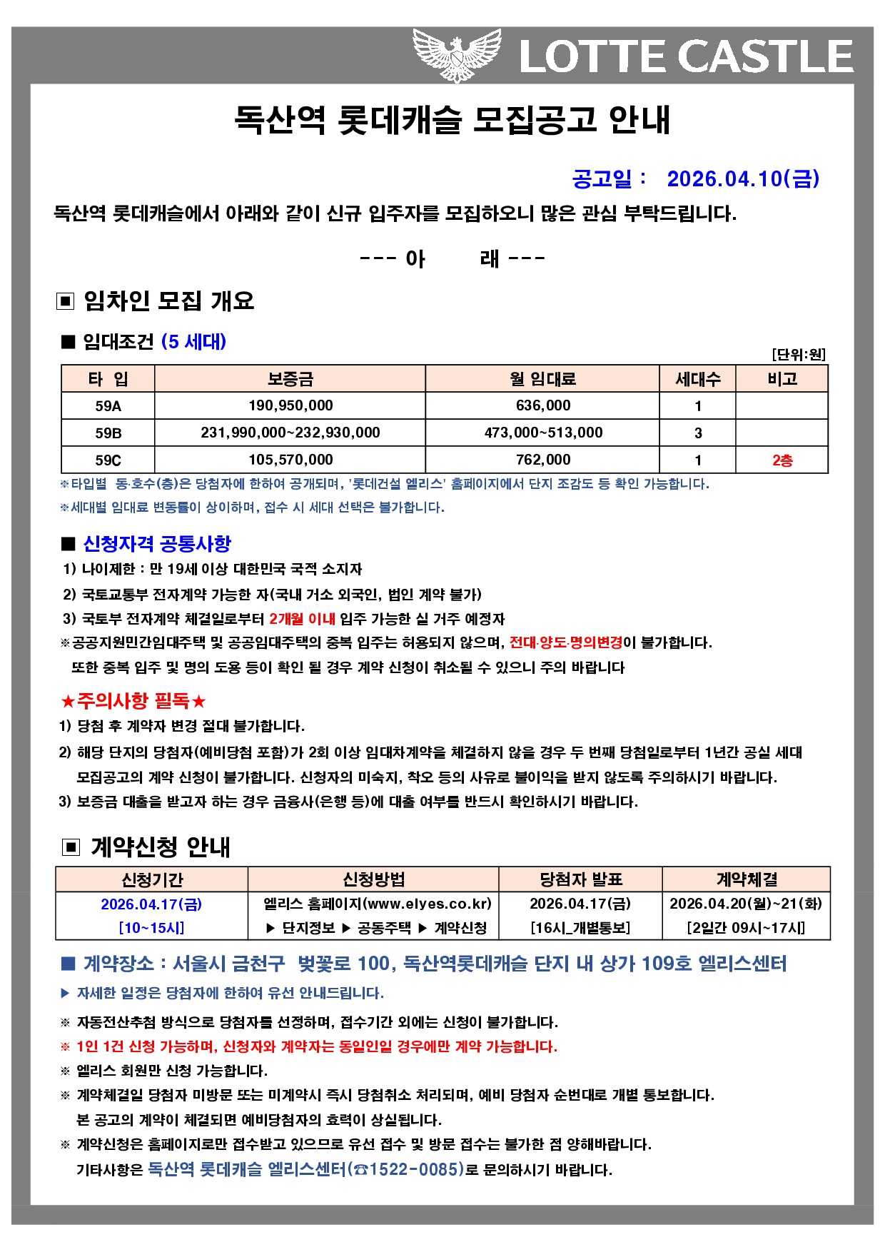 [독산역 롯데캐슬] 59타입 재임대 모집공고(접수일시: '26. 4.17.(금) 10시~15시)