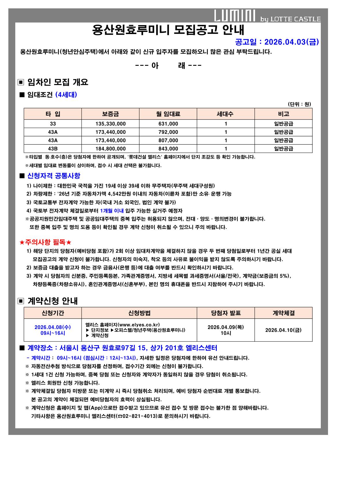[용산원효루미니] 추가모집공고(접수일 '26.04.08)