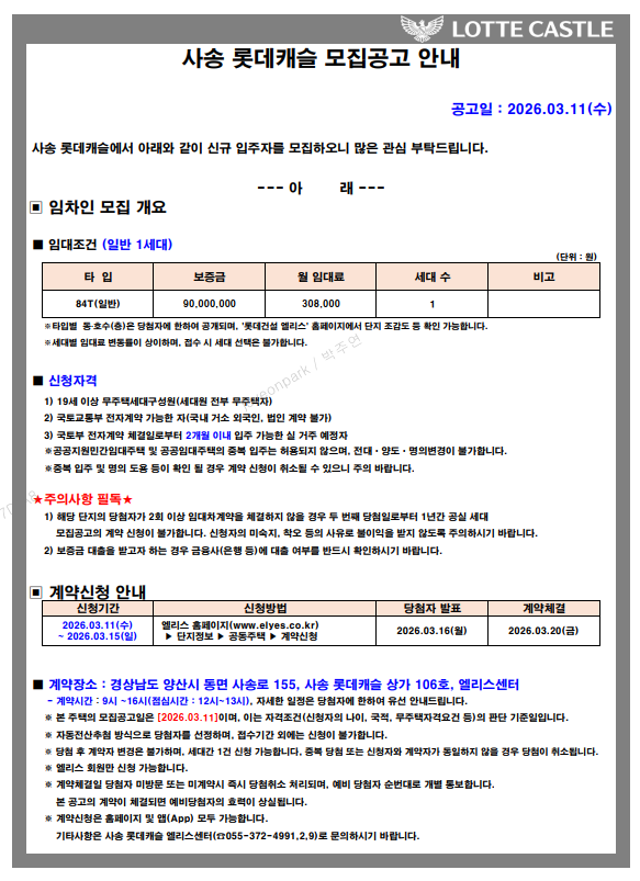 [사송 롯데캐슬] 재임대 모집공고(접수기간 : 26.03.11~26.03.15) - 마감되었습니다.