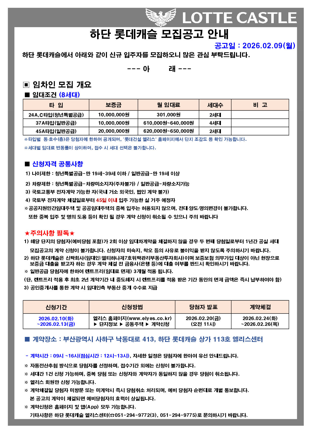 [하단 롯데캐슬]재임대 모집공고문(접수기간:26.02.10~26.02.13)