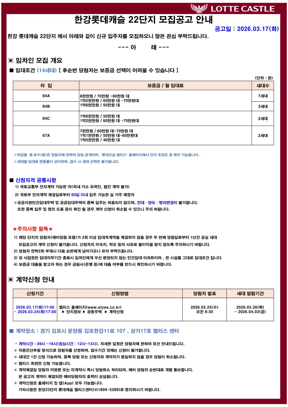 [한강 롯데캐슬 22단지]재임대 모집공고 안내(접수기간:26.03.17~26.03.24)__마감되었습니다.