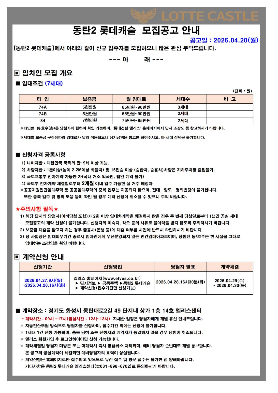 [동탄2 롯데캐슬] 공실세대 계약신청 안내 (접수기간: 26.04.27~26.04.28)